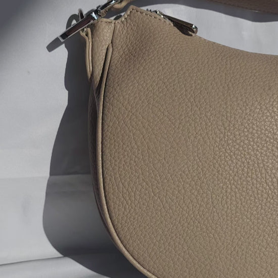 Borsa a spalla in similpelle beige a mezza luna con manico removibile.
