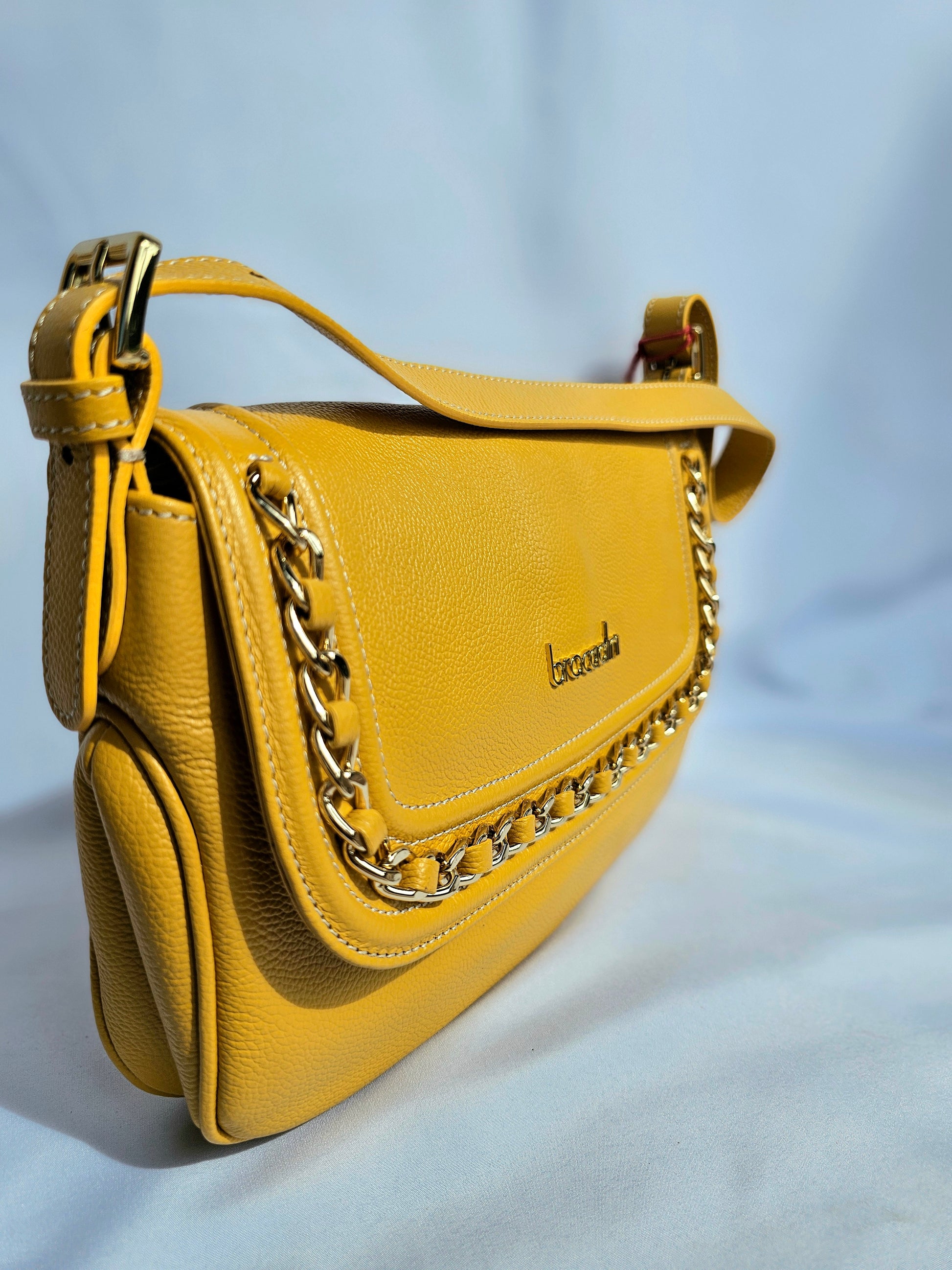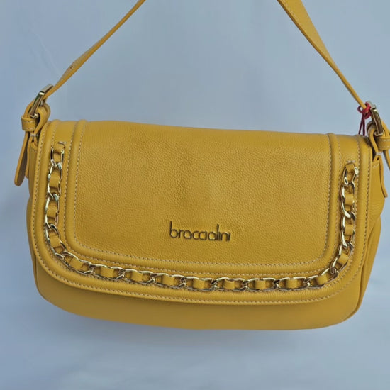 Borsa in pelle arricchita da una catena oro, apertura magnetica con tracolla regolabile e removibile