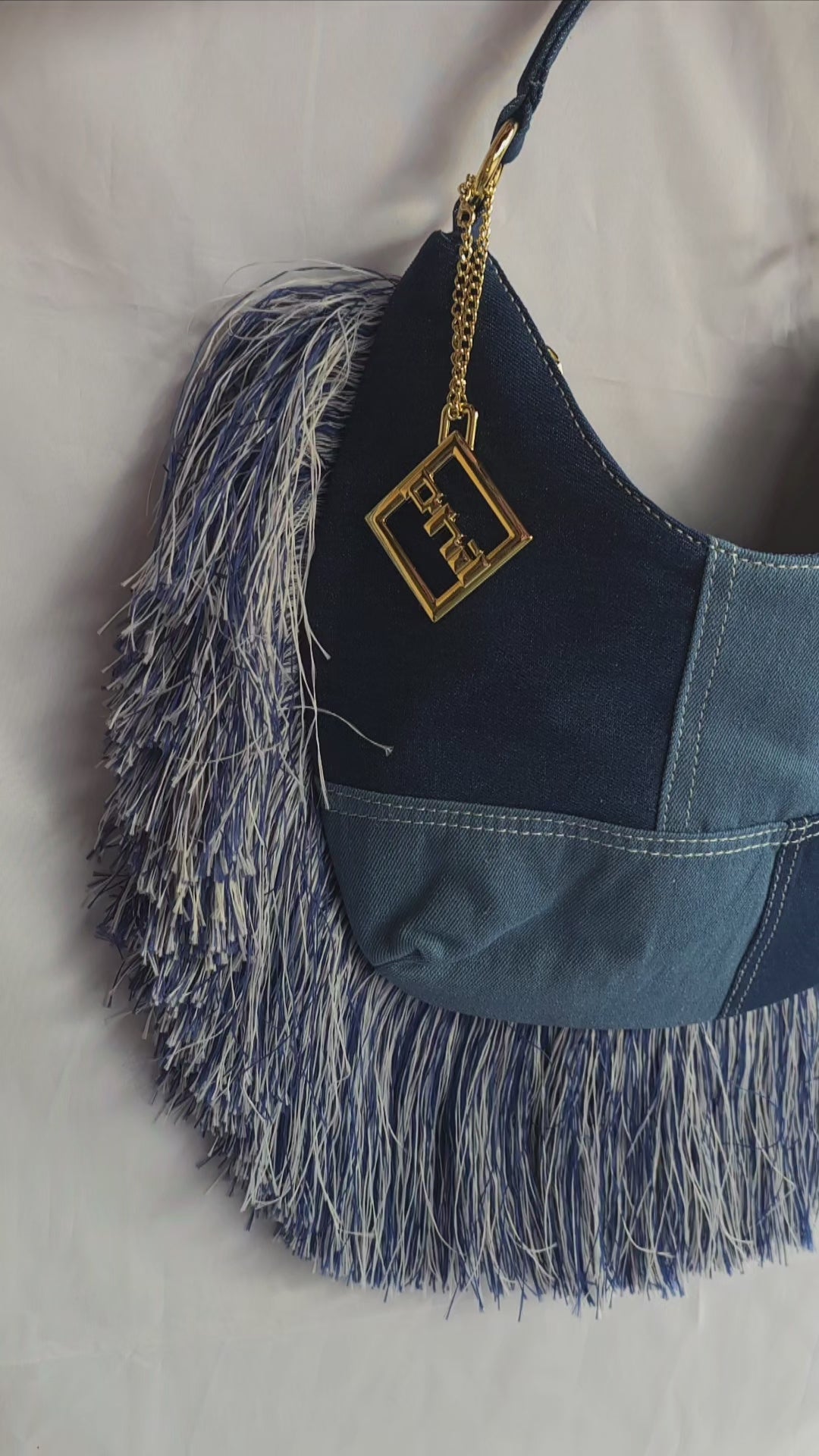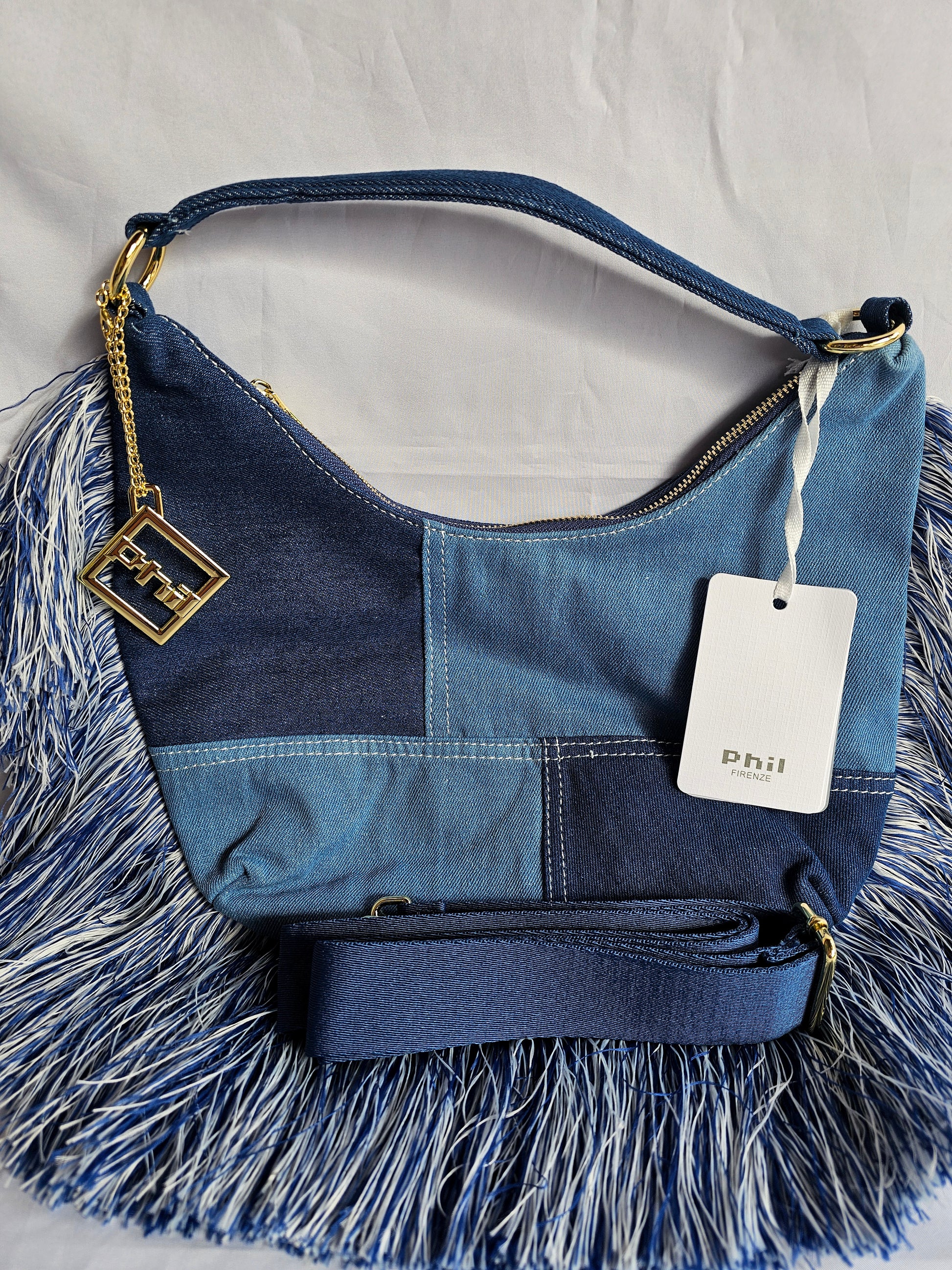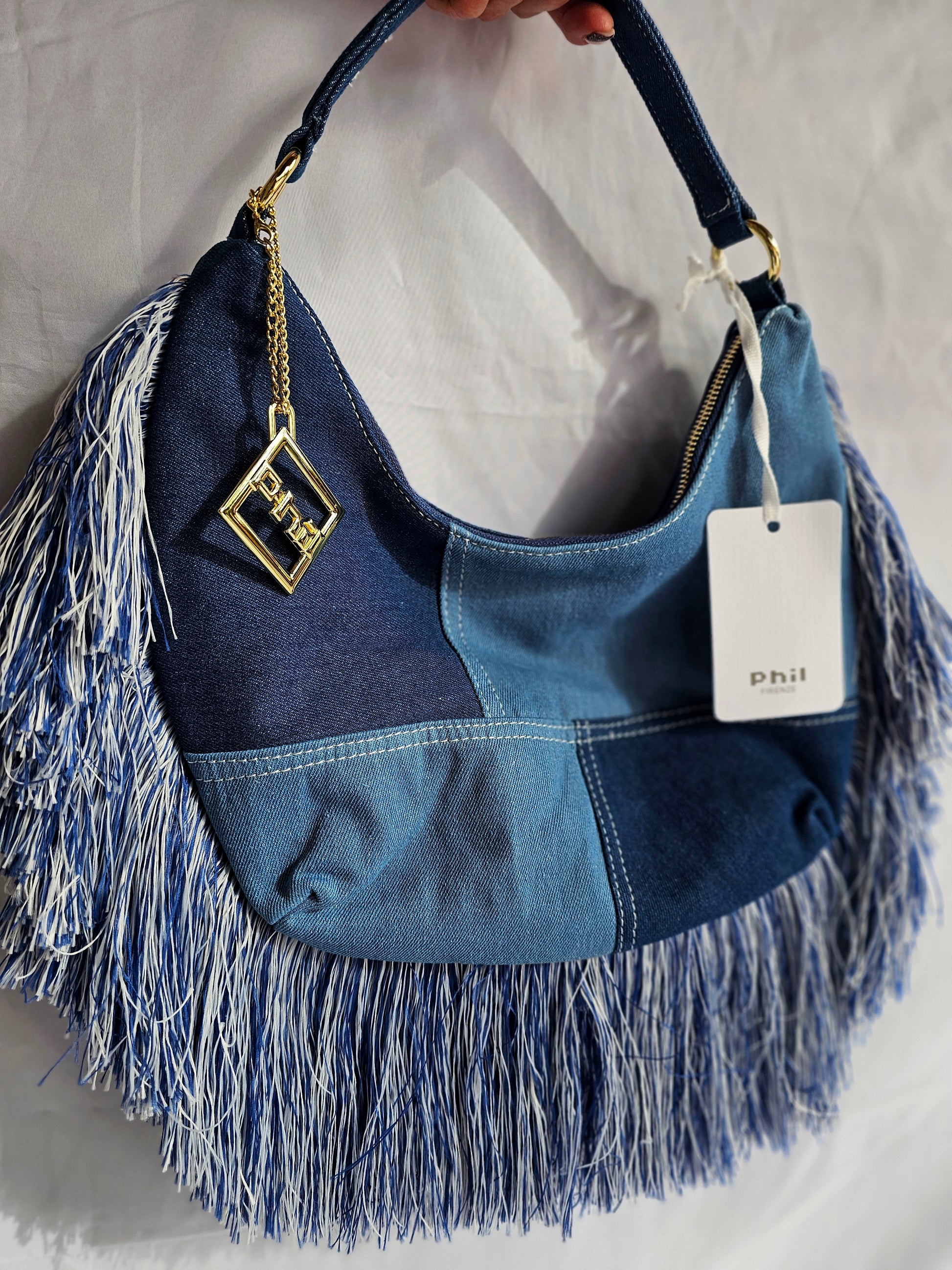 Borsa hobo in jeans con ritagli bicolore e frange di contorno. Singolo scomparto con cerniera e presenza di una tracolla in tessuto.