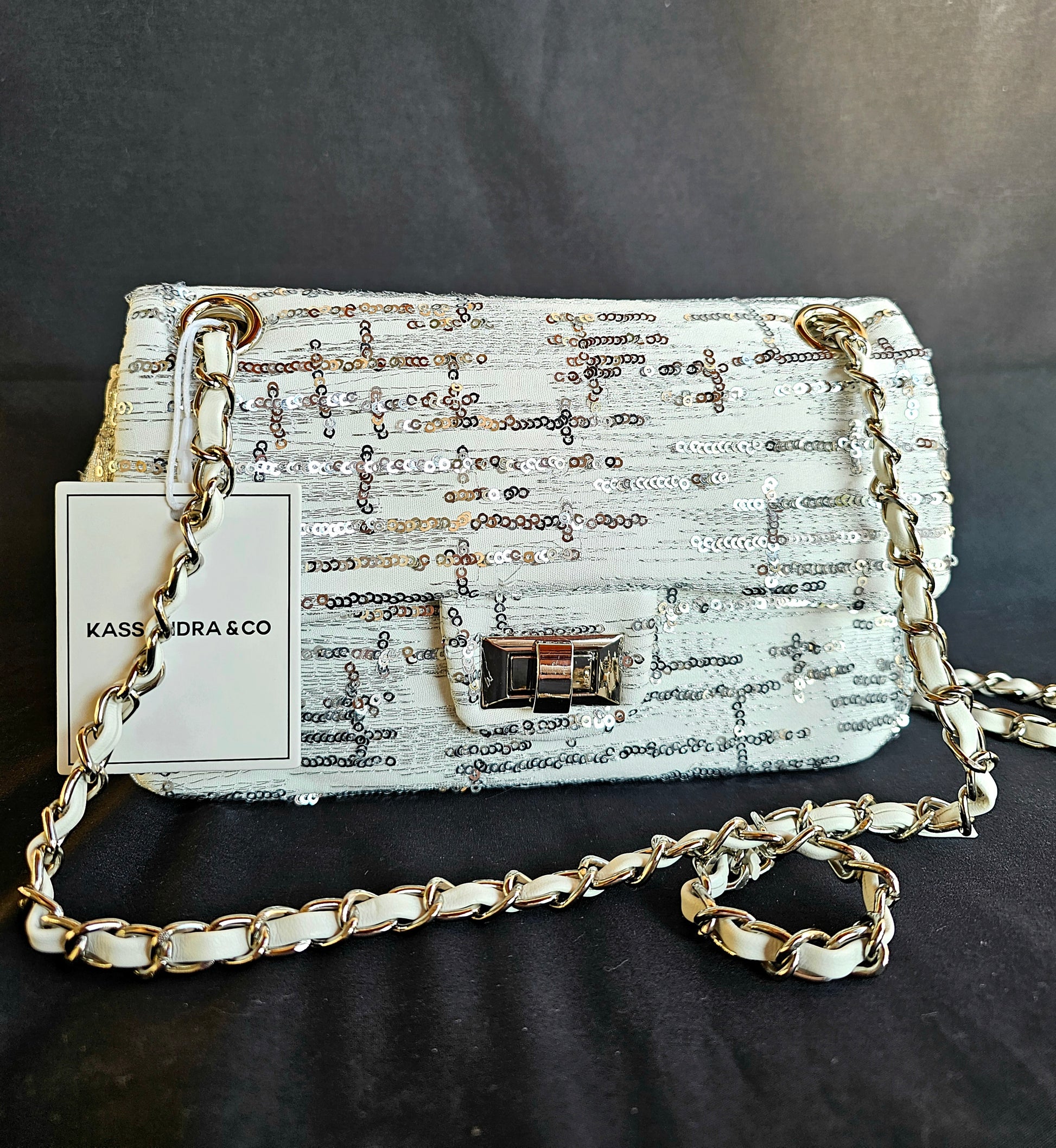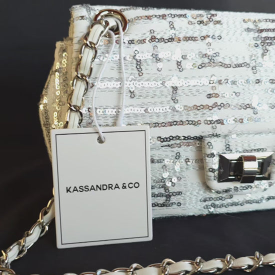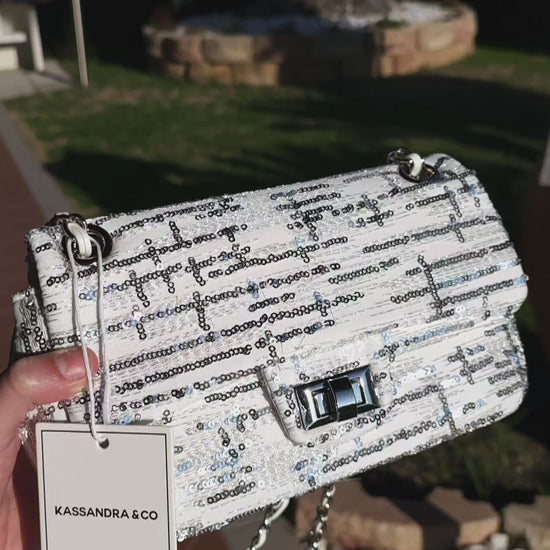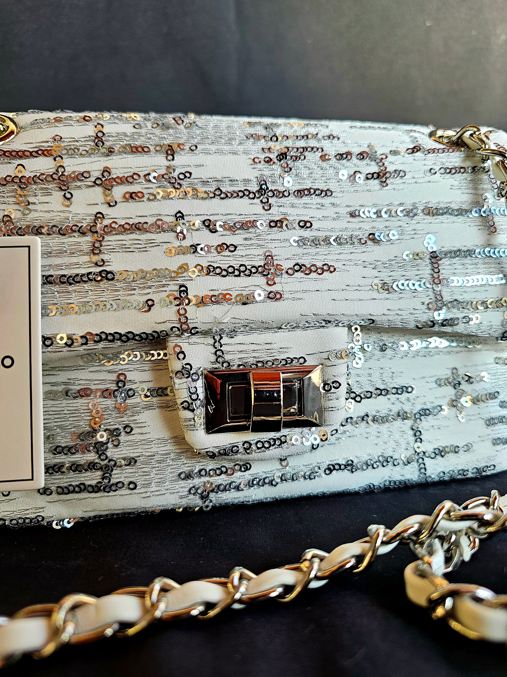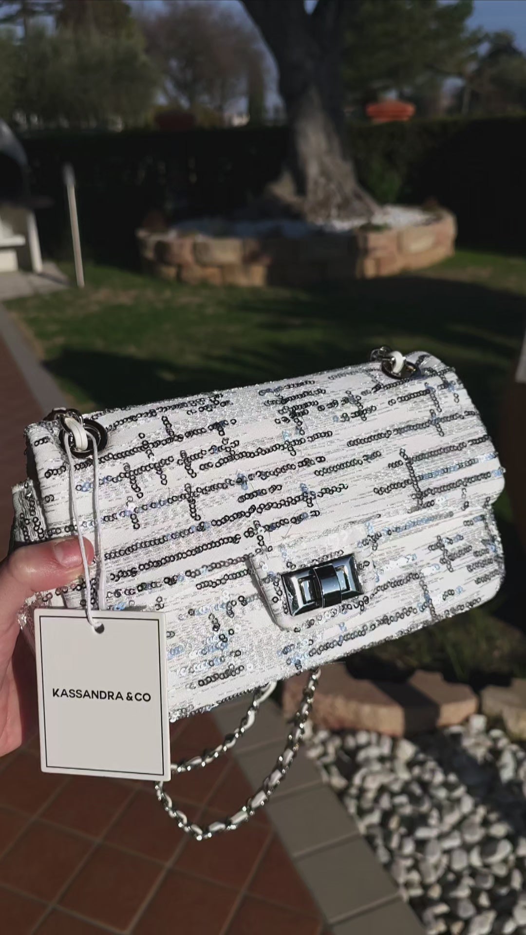 Borsa a tracolla in tessuto con paillettes versione argento, indossabile anche a spalla. Singolo scomparto con chiusura a girello.