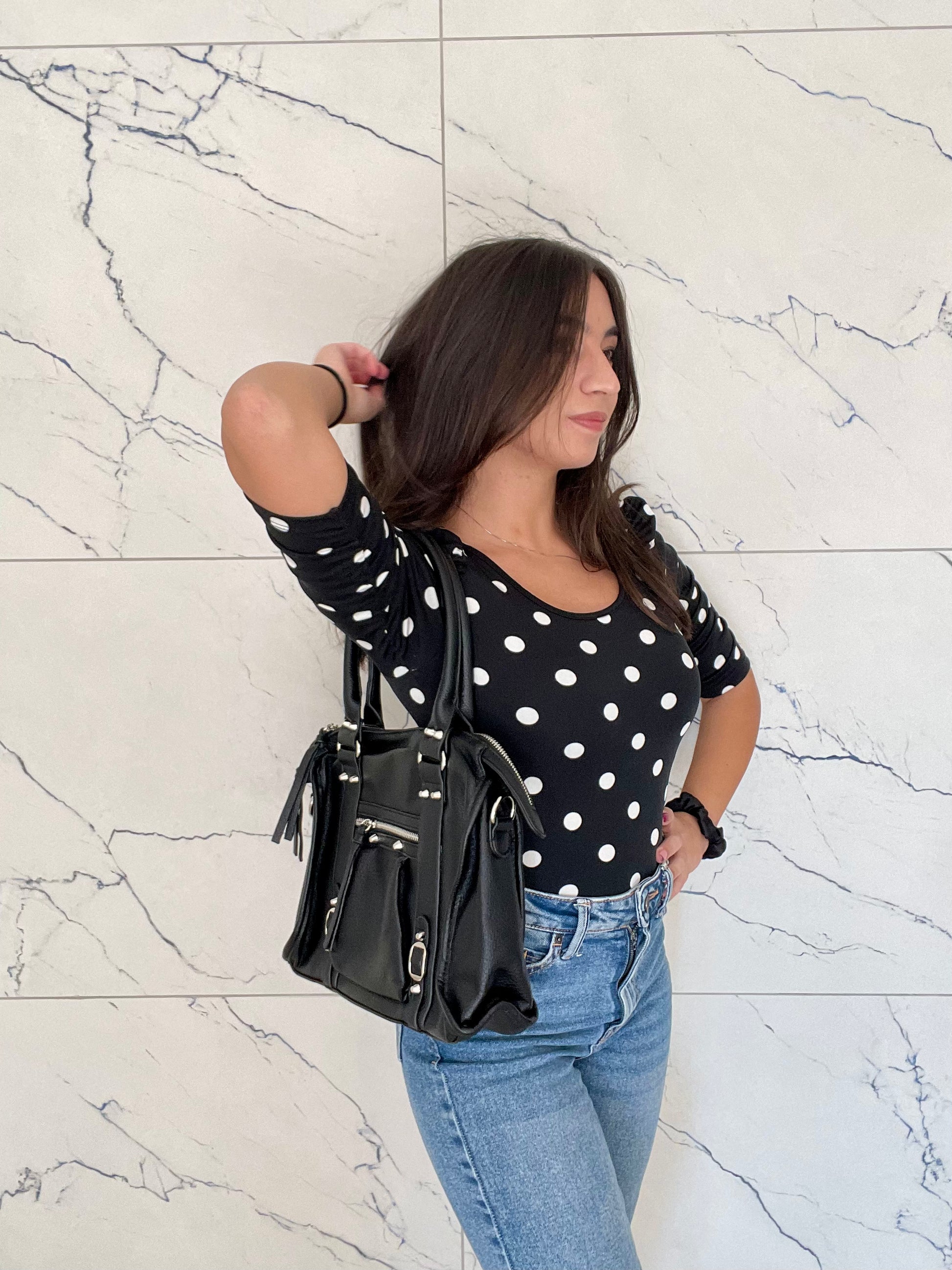 La borsa Tokyo big detta stile: linee decise, dettagli iconici e un carattere urban-chic che non passa inosservato. Capiente ma leggera, è l’accessorio perfetto per dare un tocco grintoso e contemporaneo ad ogni look, dal giorno alla sera.