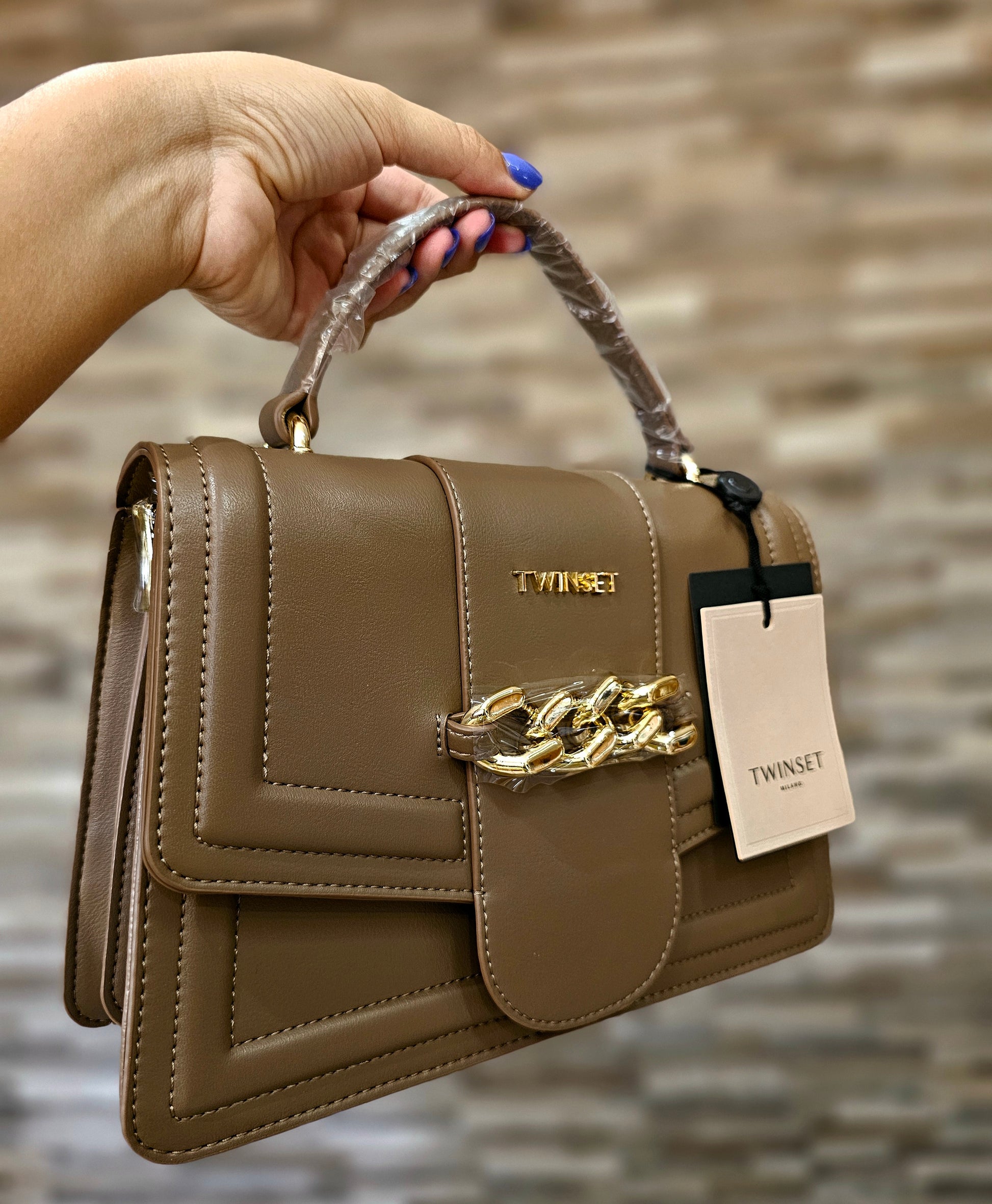 Borsa a mano o a tracolla Twinset monocolore con chiusura magnetica. Dettaglio con catena dorata.