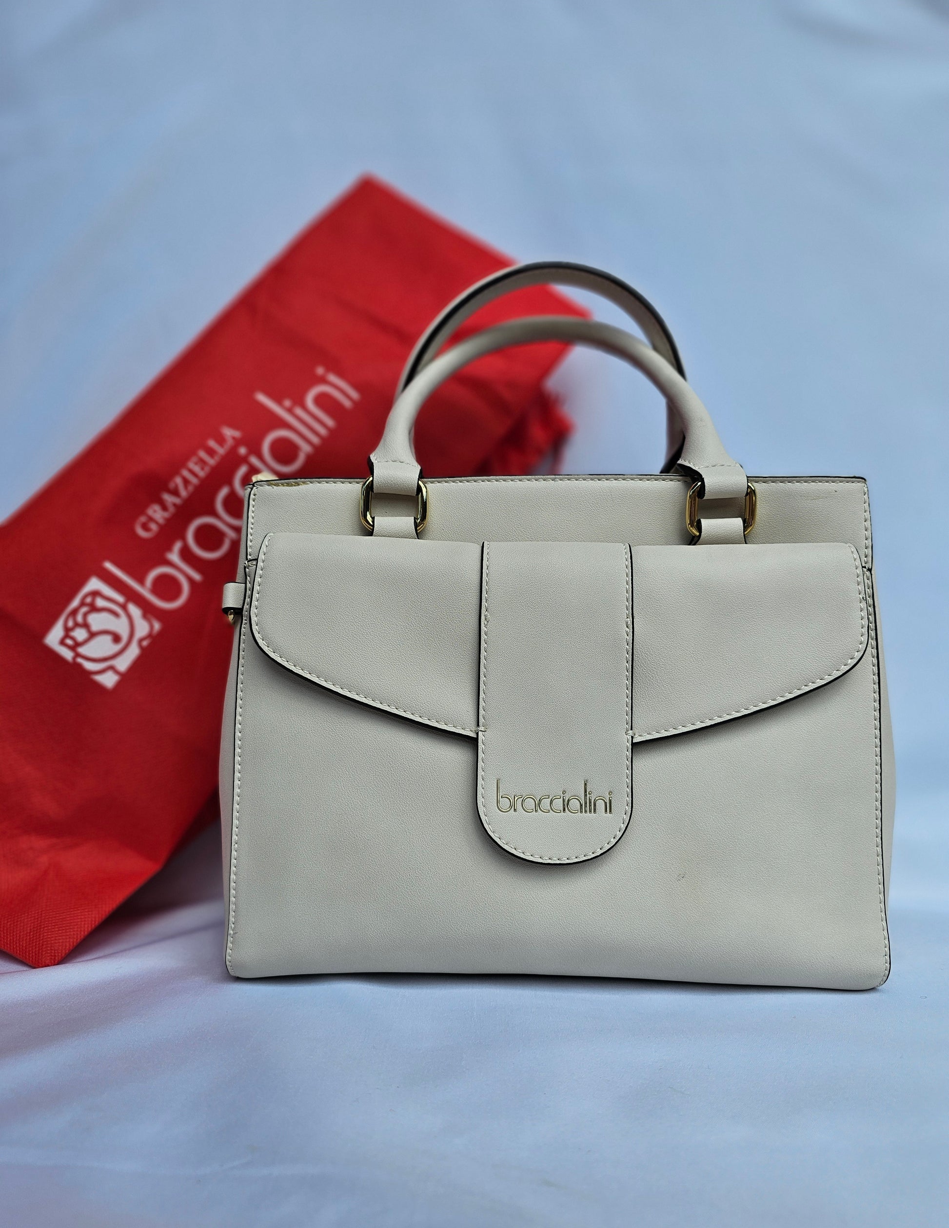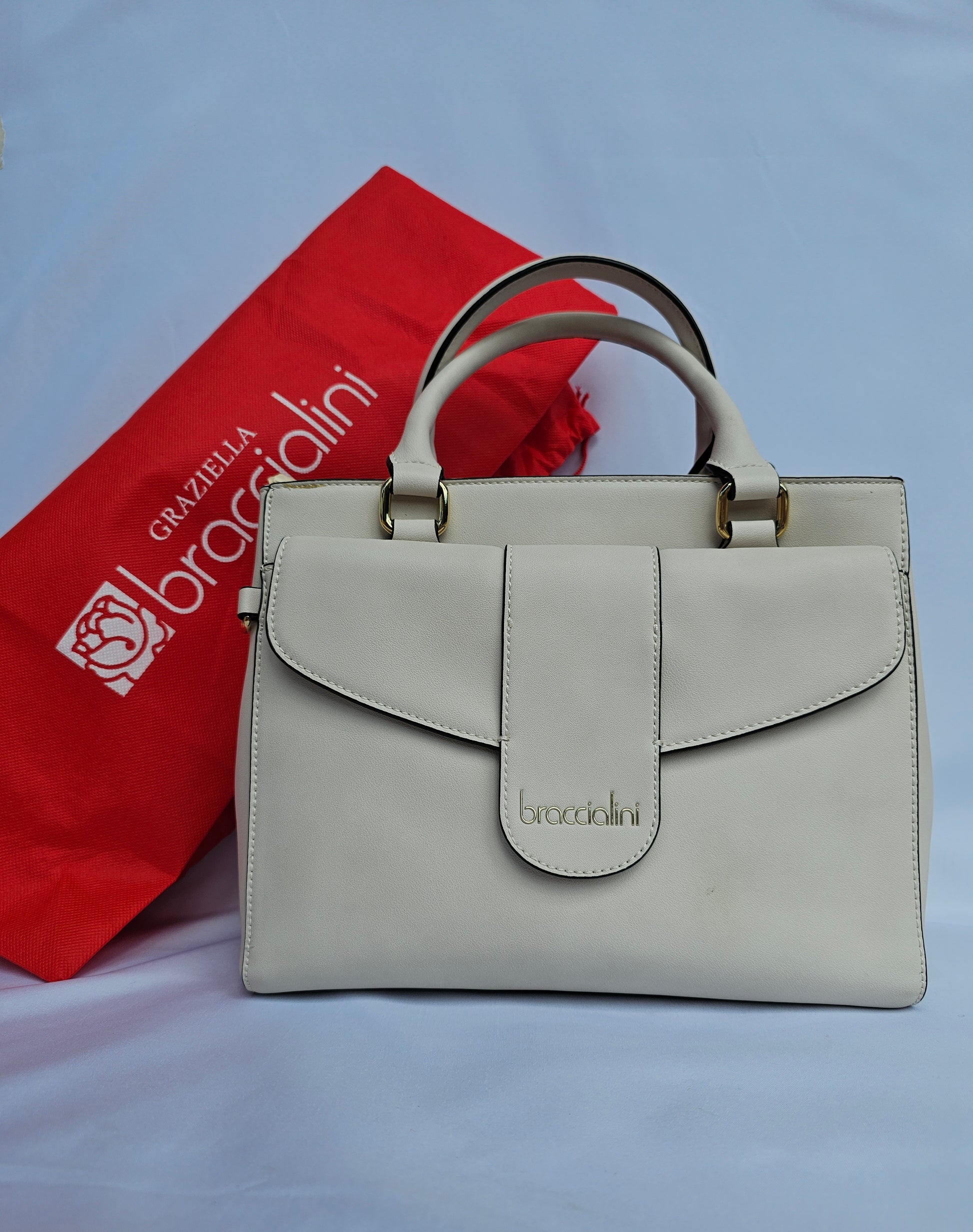 Borsa Braccialini fine ed elegante in pelle. Presenta 3 tasche interne ed una esterna, abbellita da uno charm con specchio.