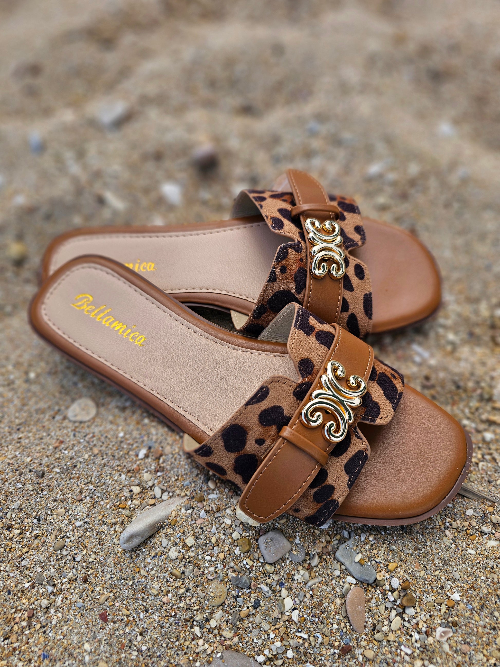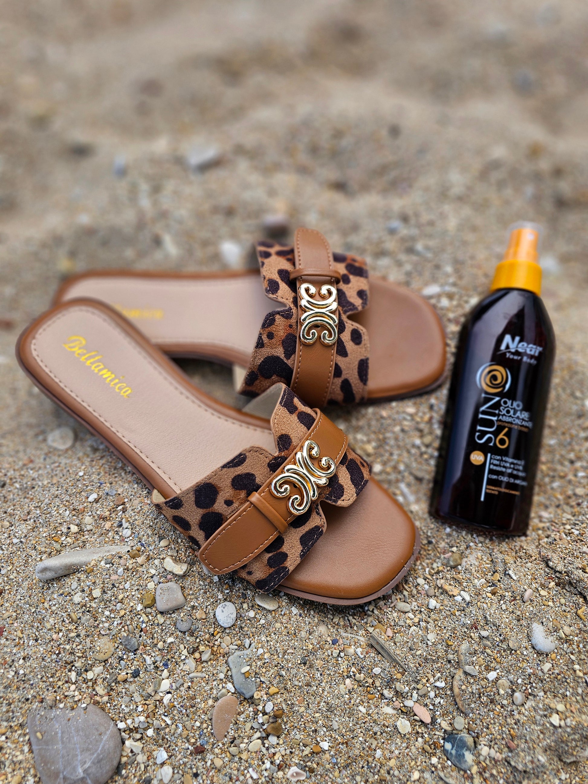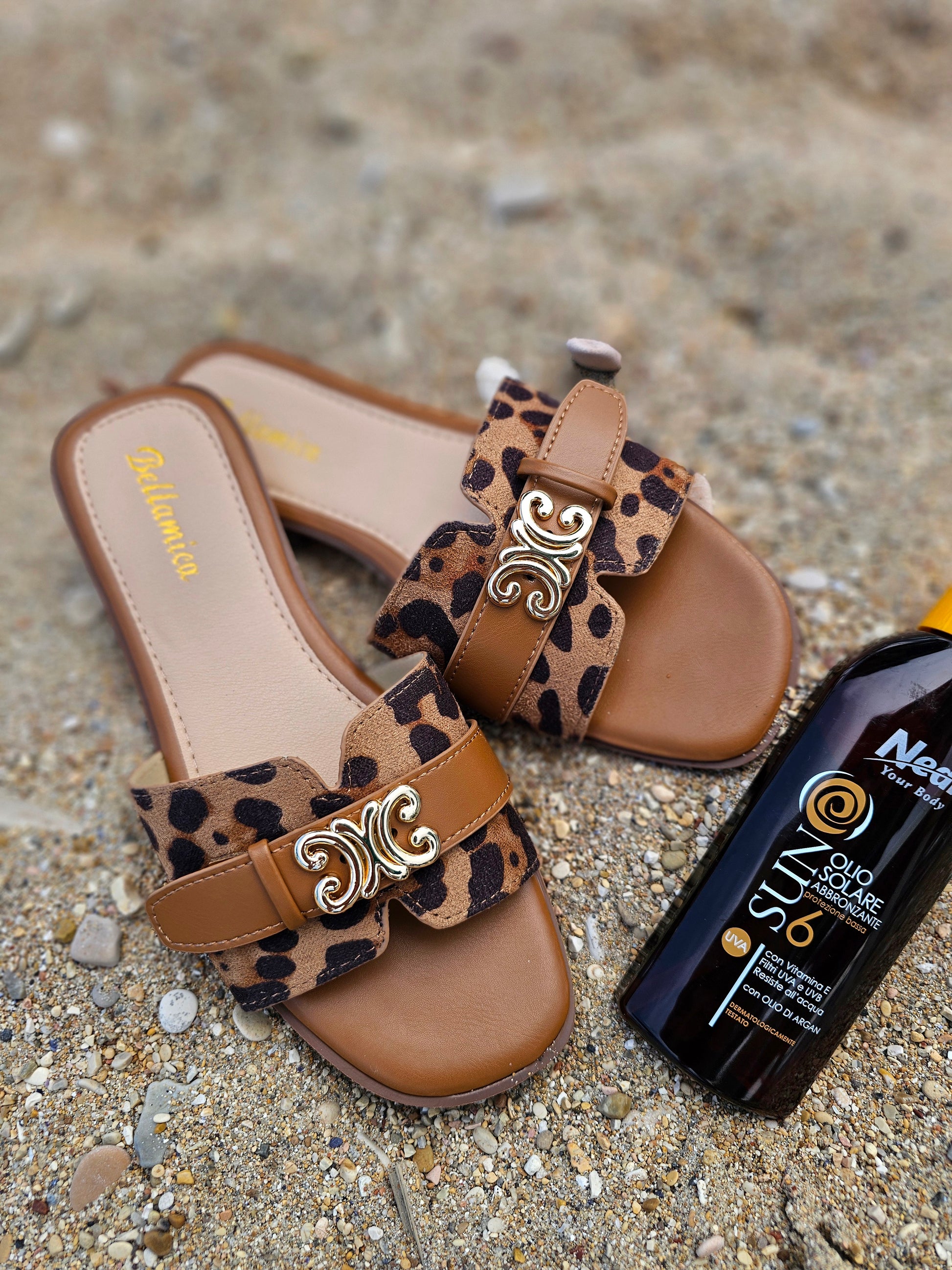 Ciabattine maculate in similpelle e camoscio. Impreziosite da una cintura in similpelle con charm.