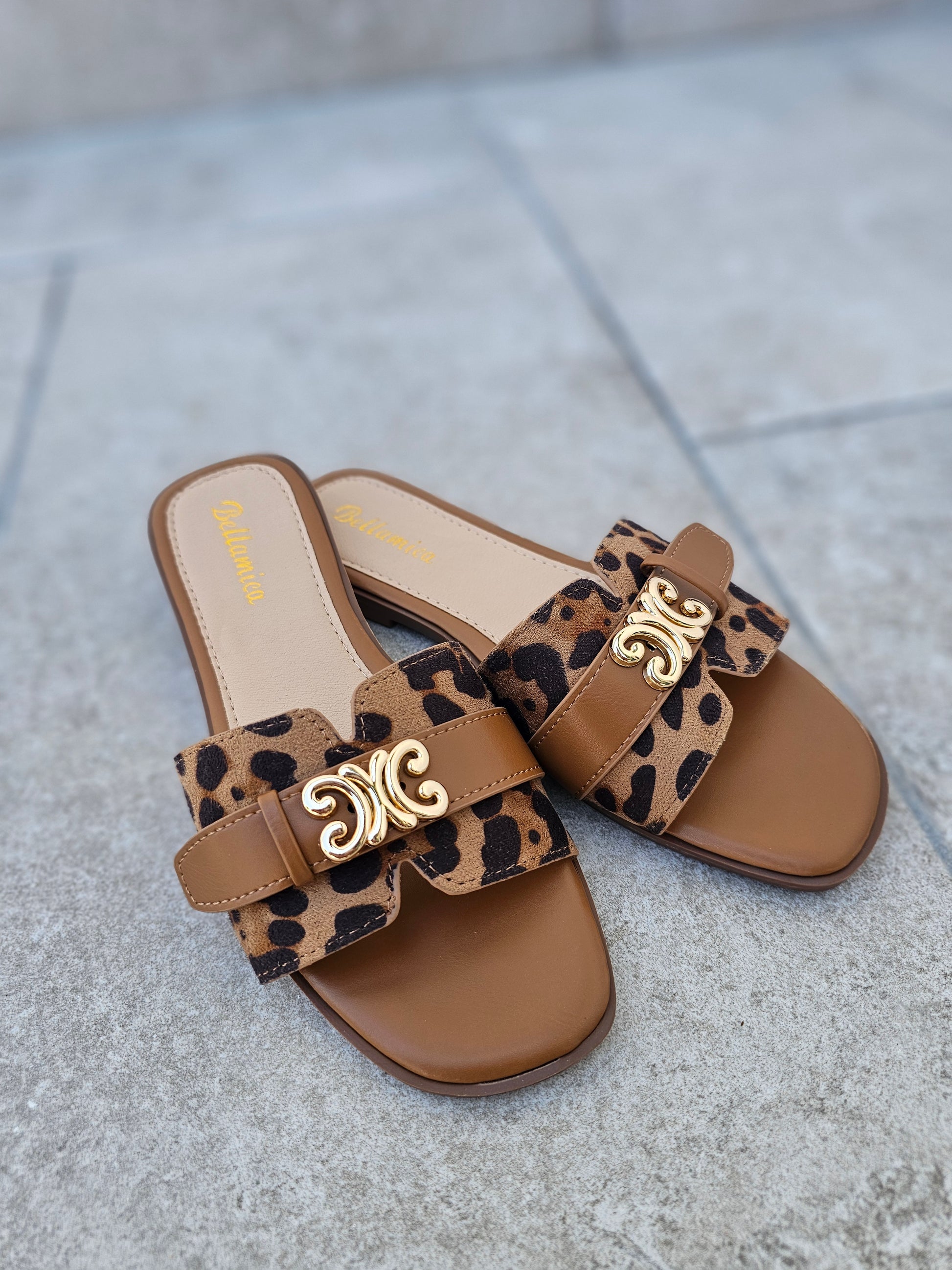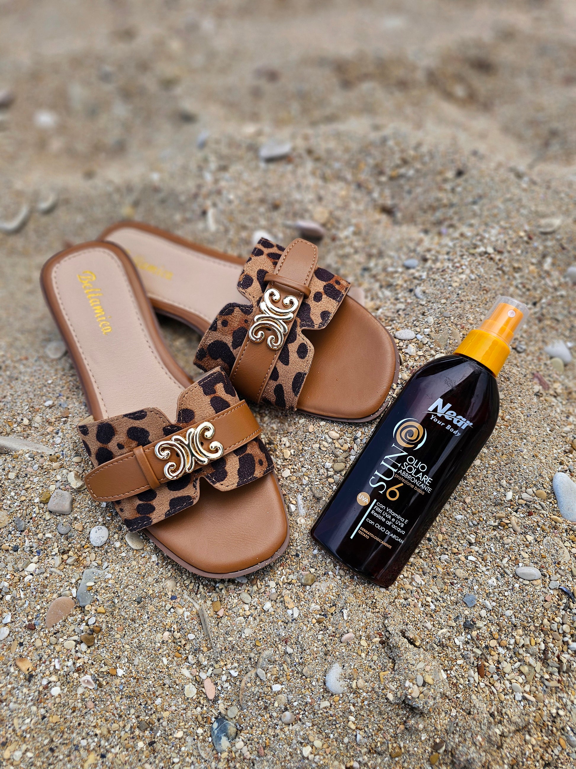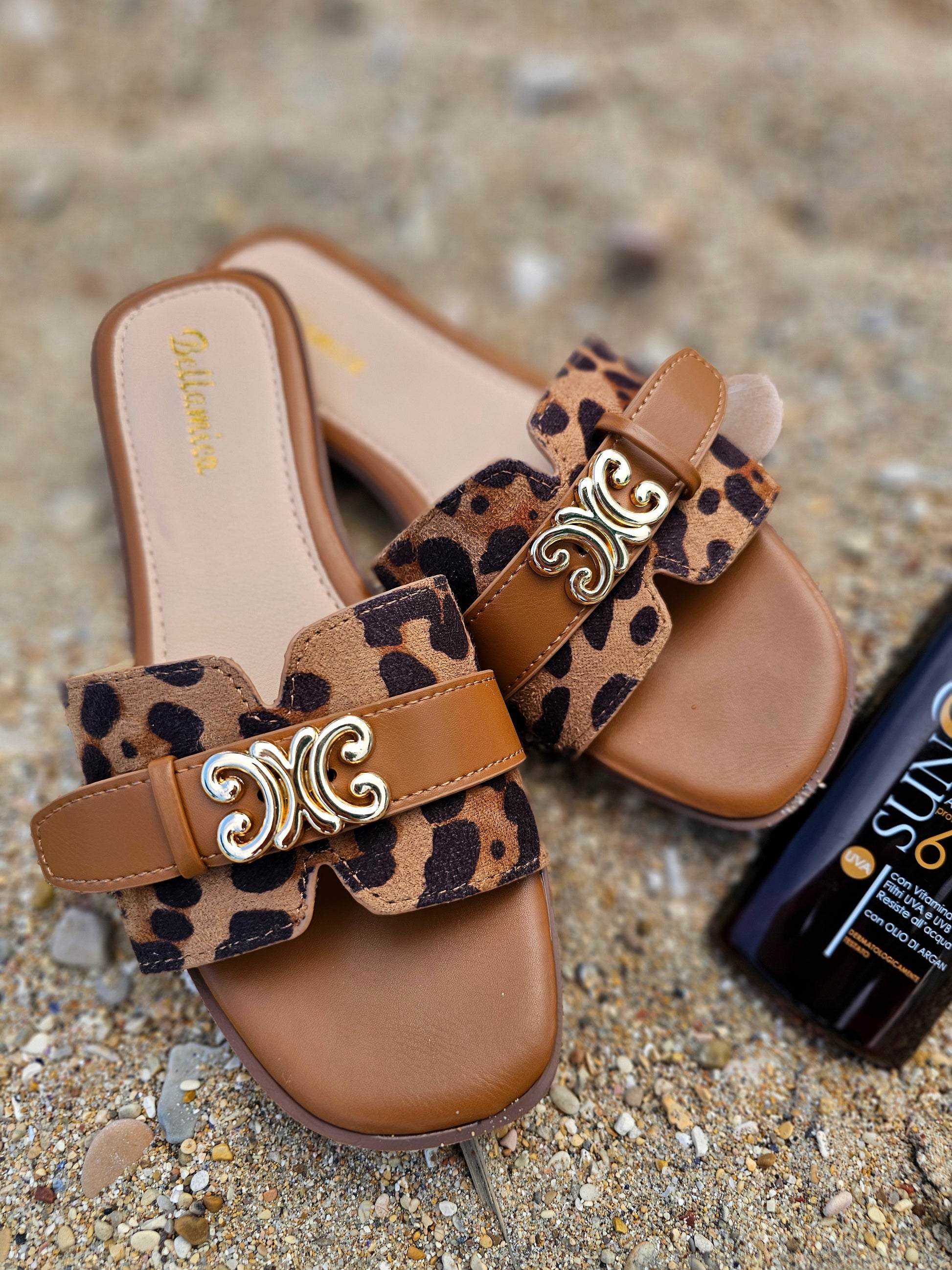 Ciabattine maculate in similpelle e camoscio. Impreziosite da una cintura in similpelle con charm.