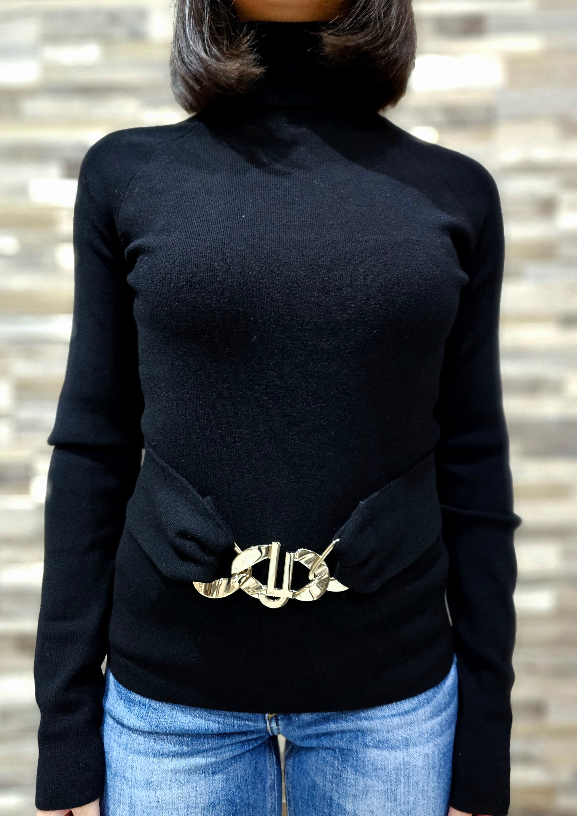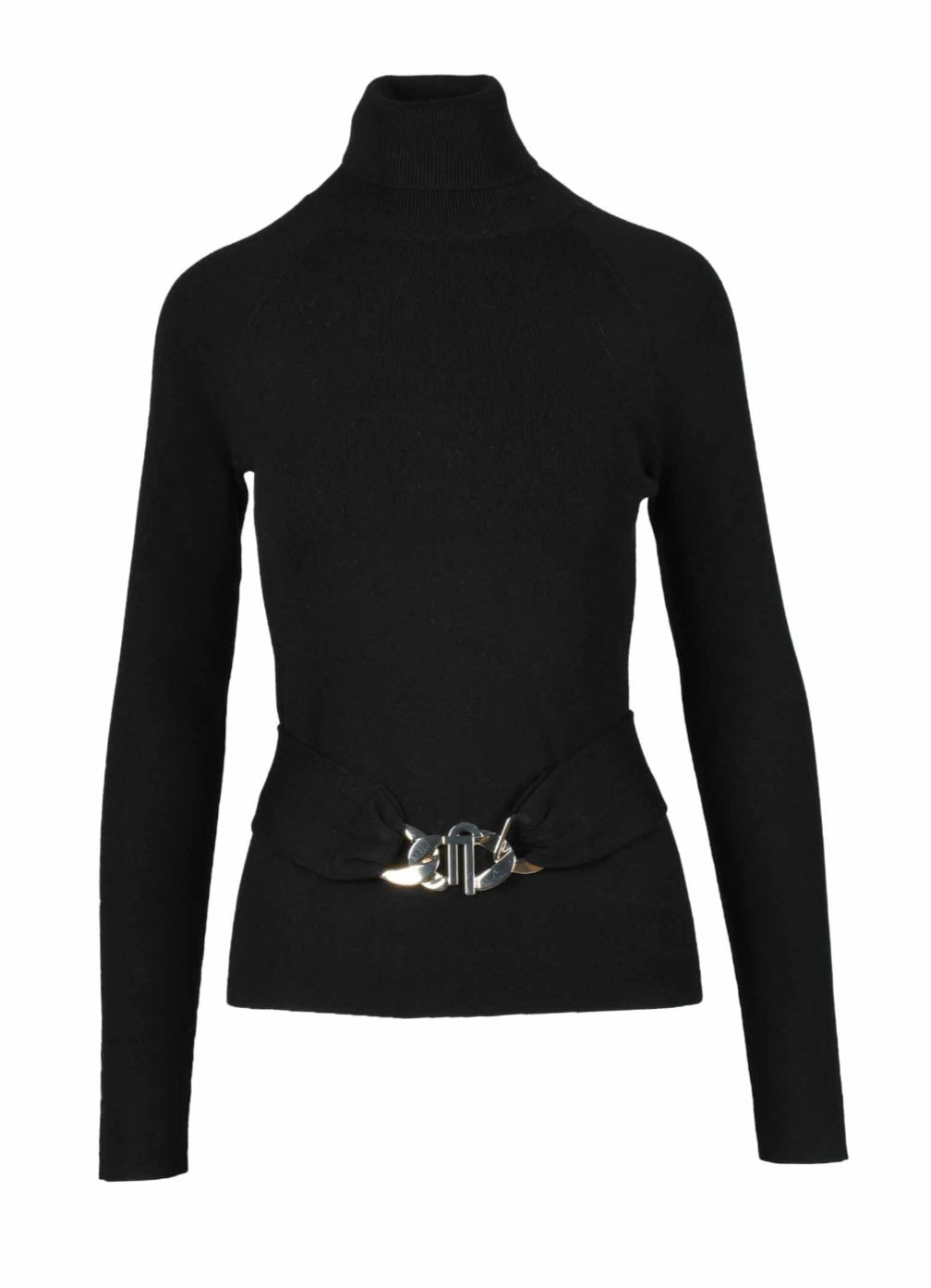 Dolcevita Liu Jo realizzato con fibre di origine forestale. Misto viscosa impreziosito da una cintura elastica con fibbia gioiello logata e da un oblò sul retro.